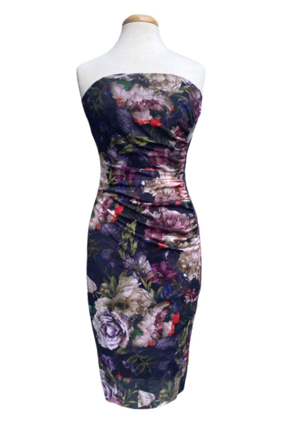 SLOAN Strapless Ruched Knee Length Black and White Print Dress
