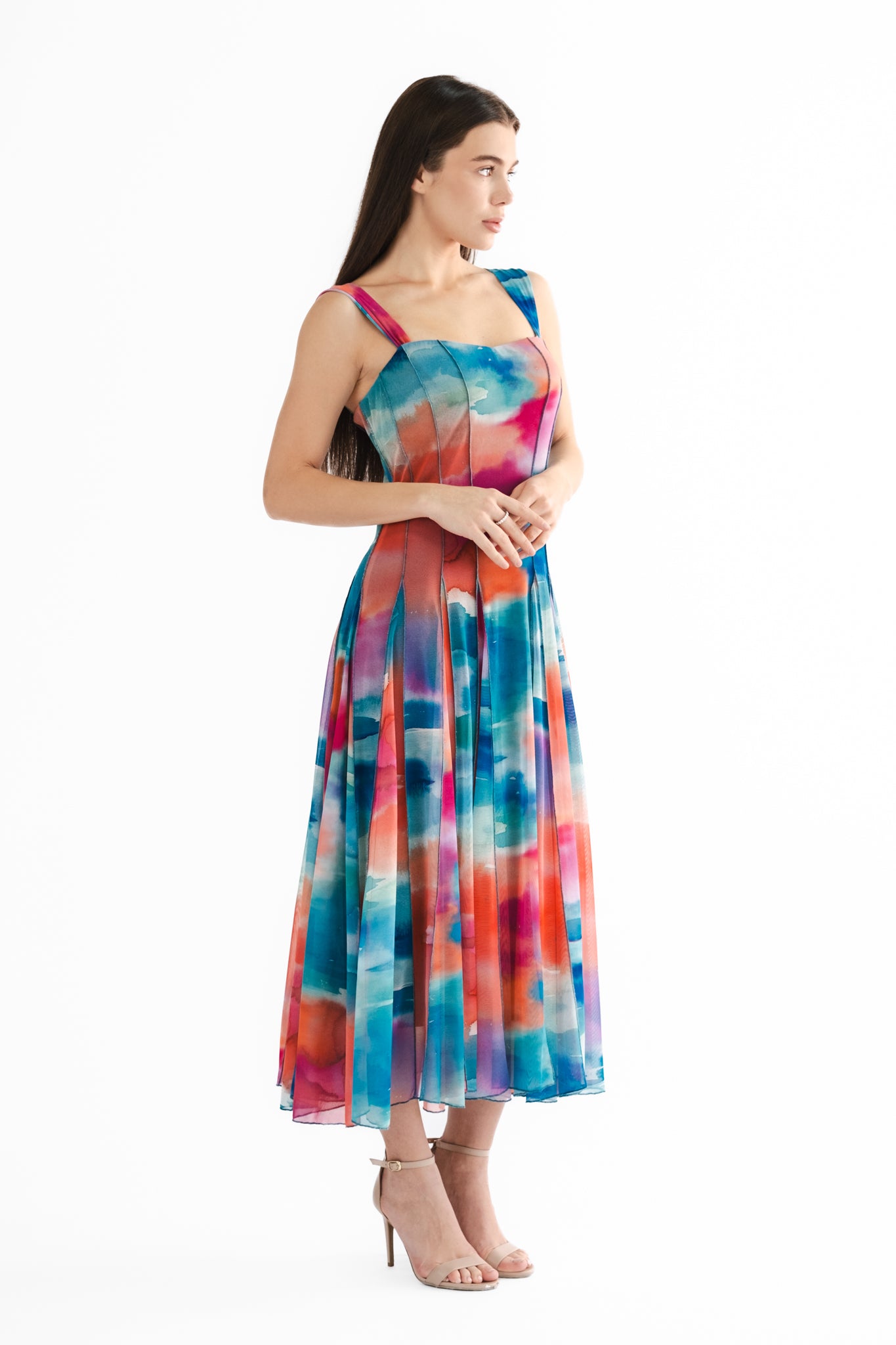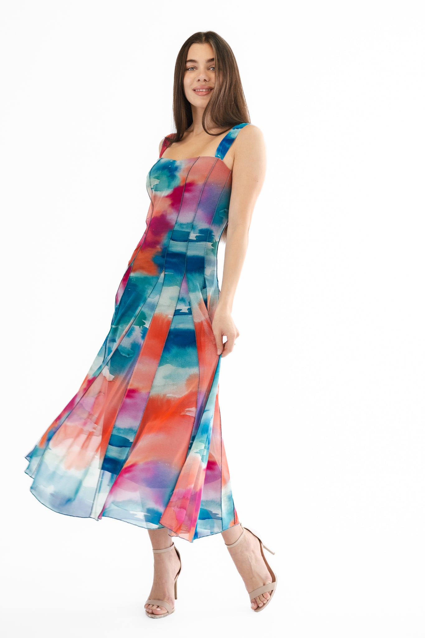 GRACE 822 Sleeveless Tea Length Fit N Flare Paneled Dress