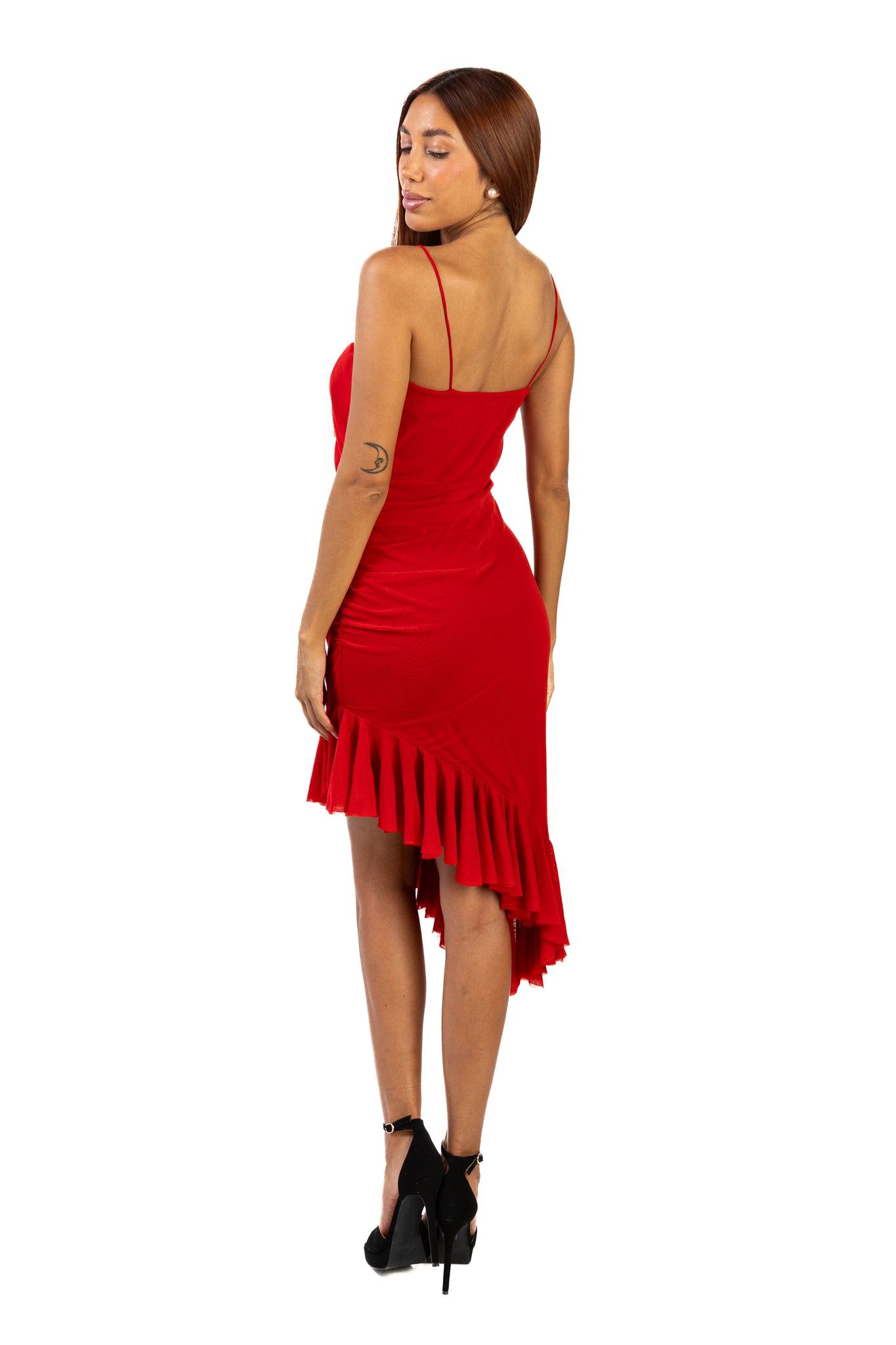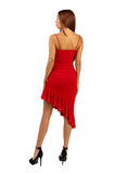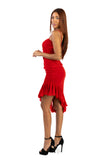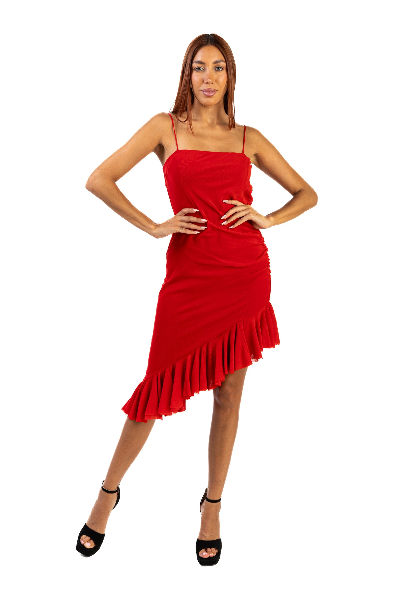 MAXIMA Sheath Fitted Dress with Side Ruching, and Slanted Ruffled Hemline