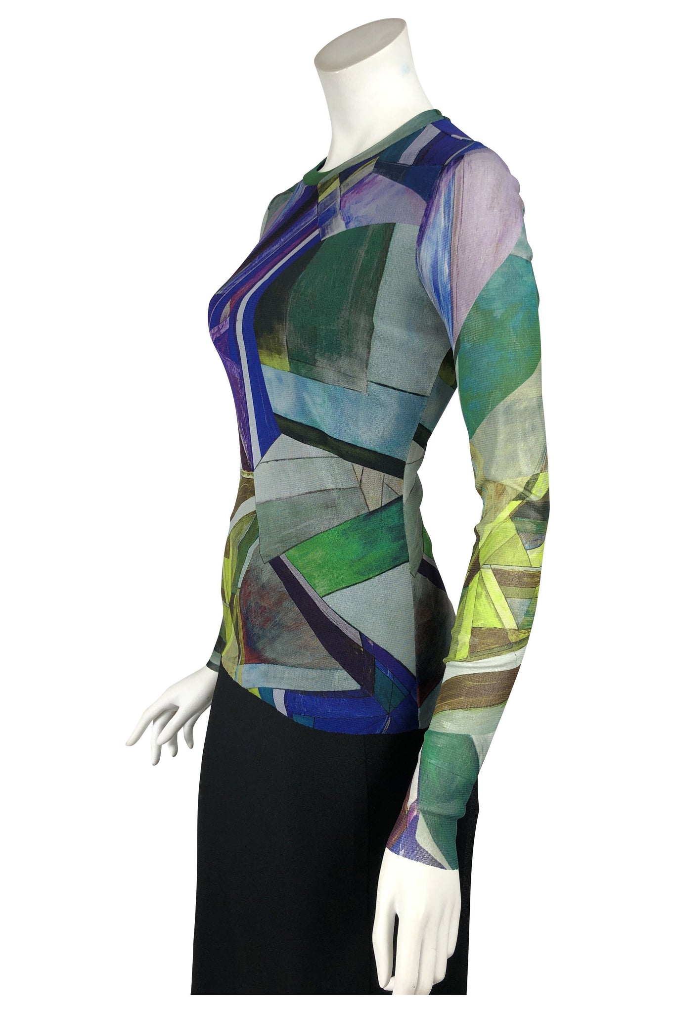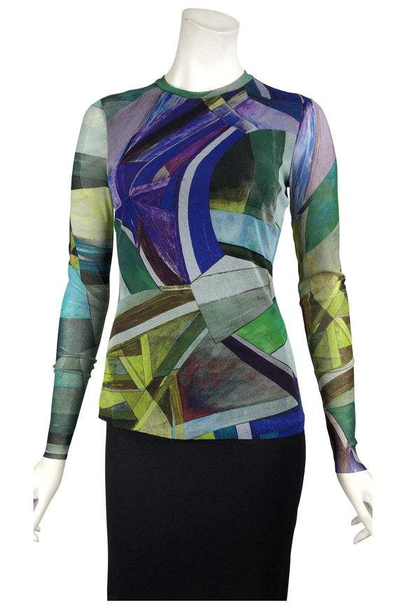 Crew neck. Body fully lined. Sheer long sleeves. Gorgeous luxury mesh in shades of purple, green, teal and black