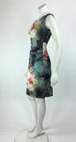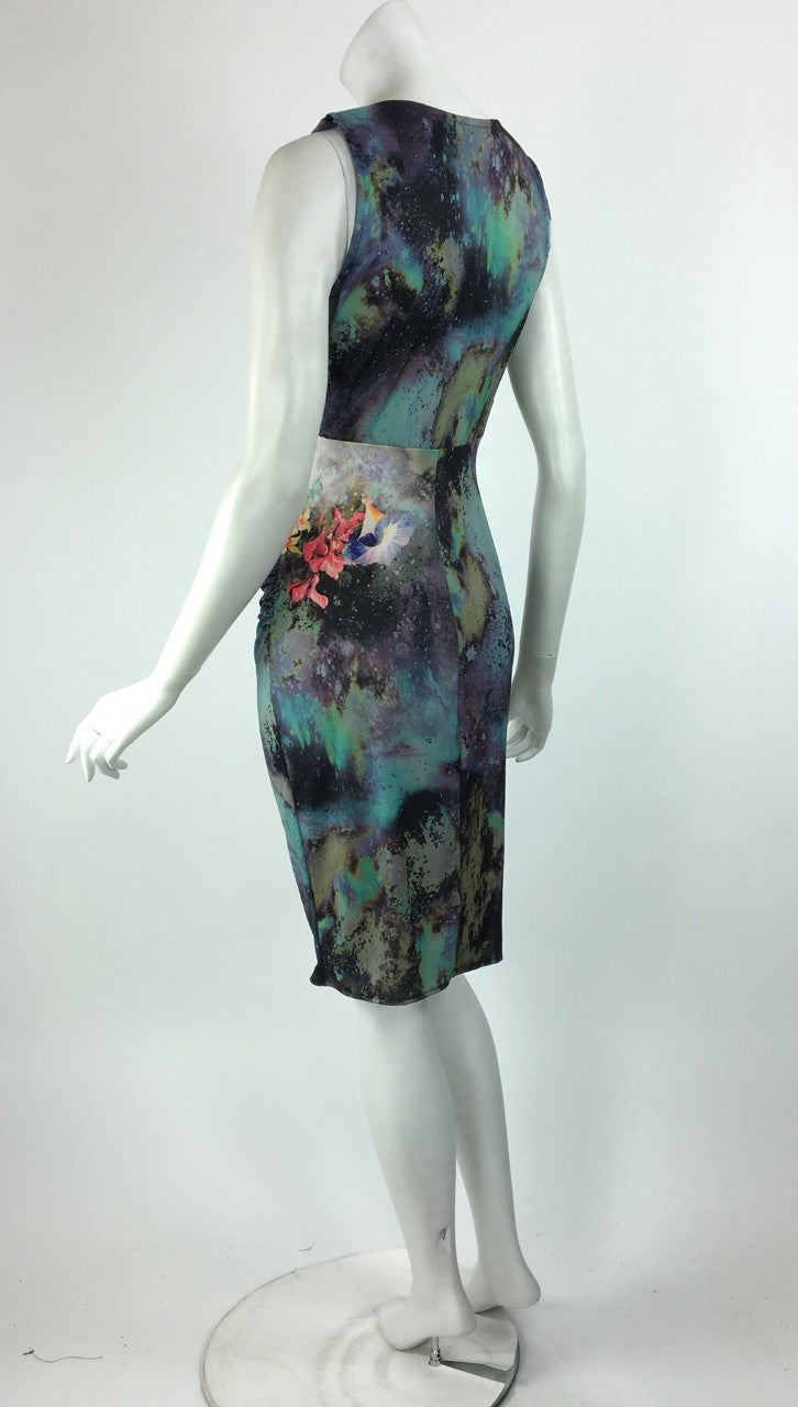 Stunning sleeveless print knee length print dress with cowl neck and empire waist. Ruched front to conceal belly and flatter the figure. Stretch fabric for comfort and fit. Abstract print in gorgeous shades of lilac, teal and sage.