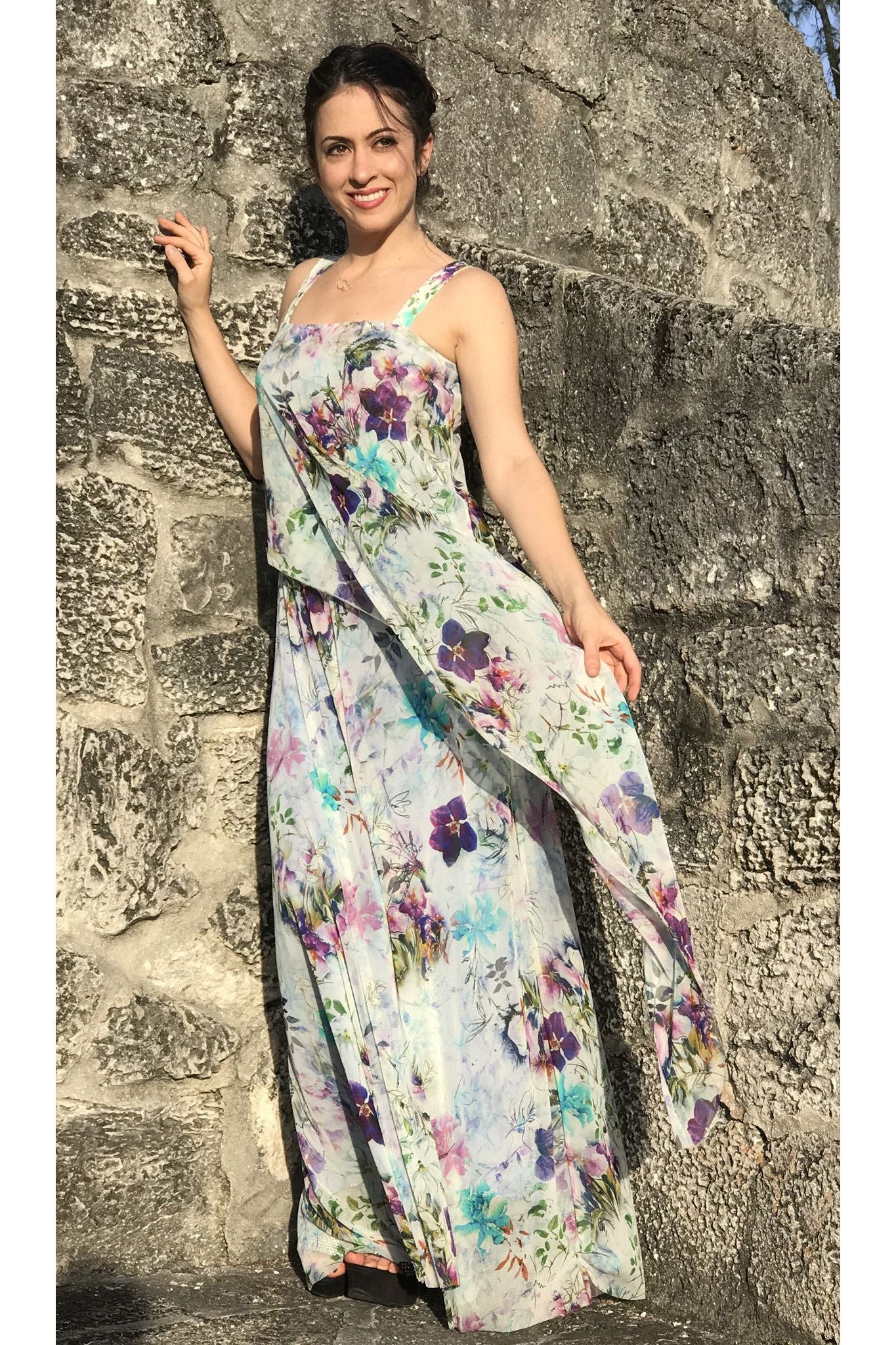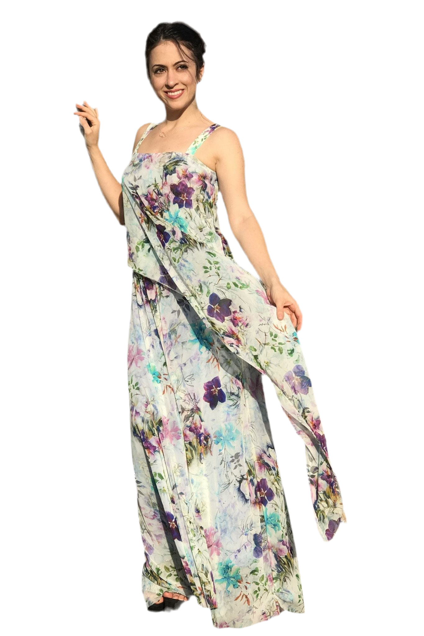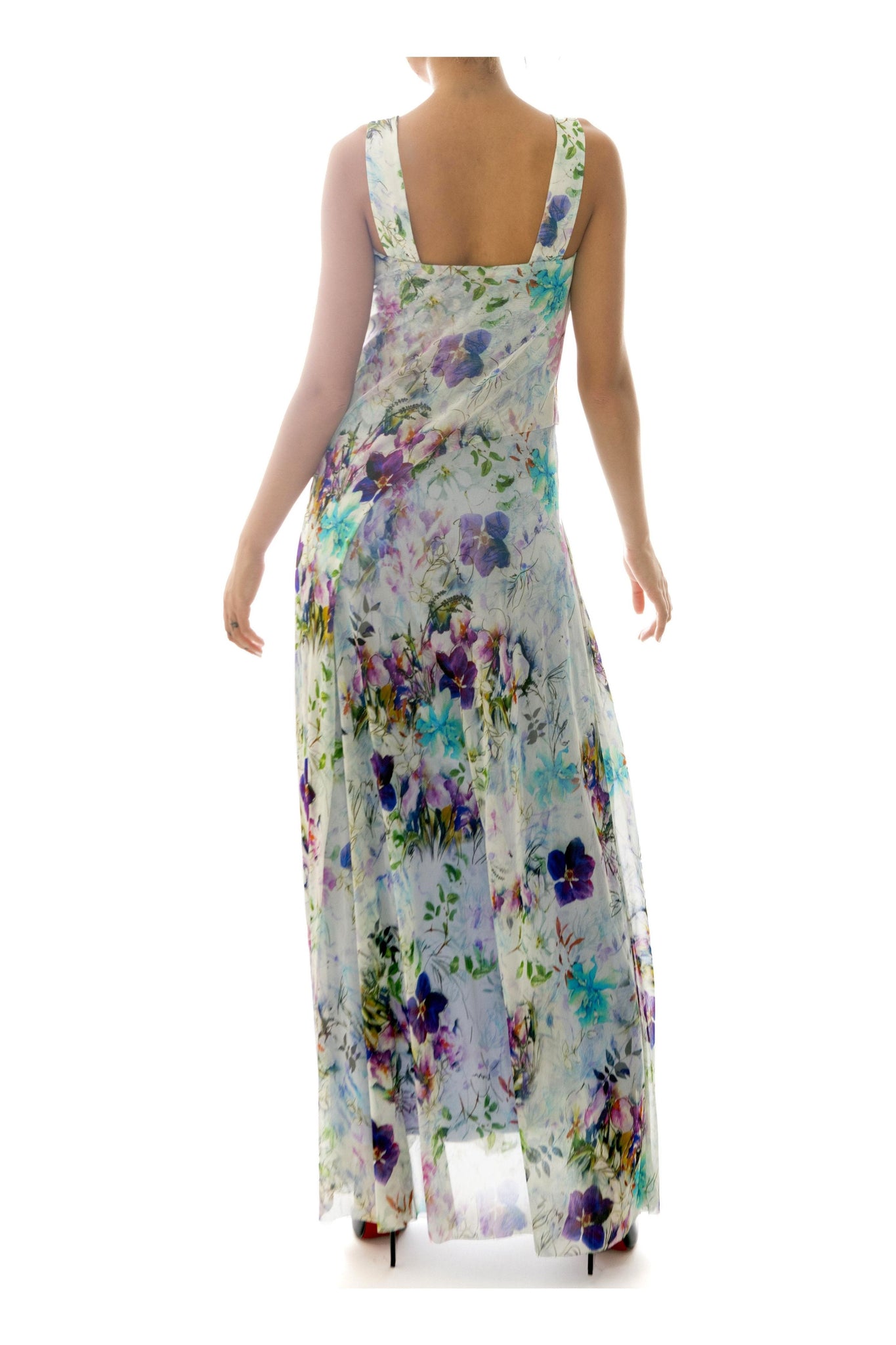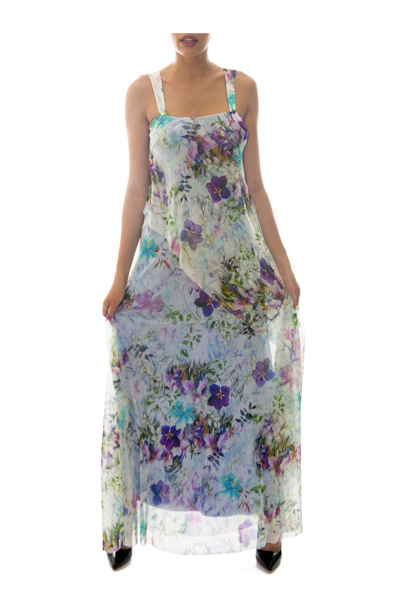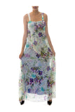 Romantic full length sleeveless dress, with generous straps, a flattering overlay and a lovely smooth neckline. Printed mesh fabric fully lined in blue. Flatters any and all body types with a roomy full length flow.This idyllic print dress evokes the floral sights and scents of an Aspen slope in summer.