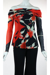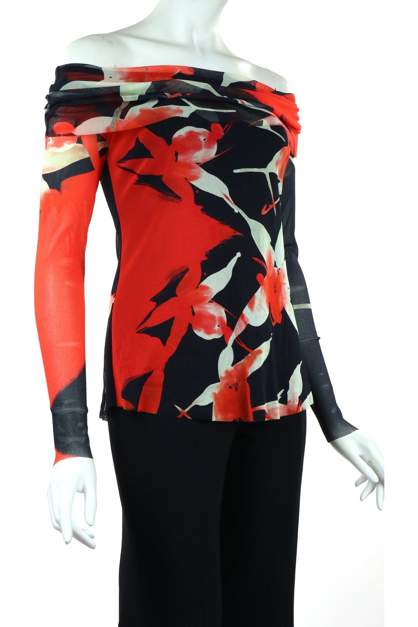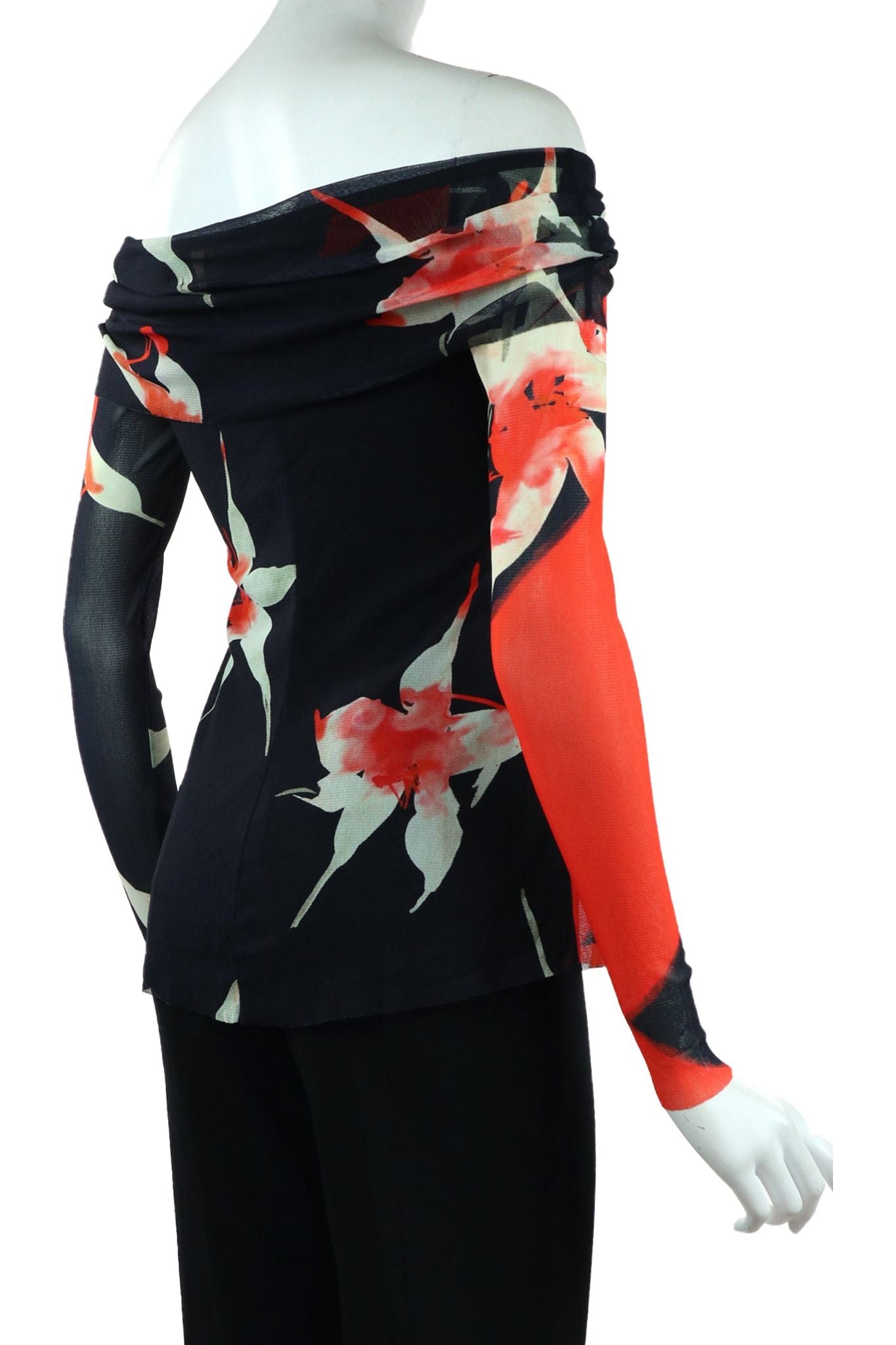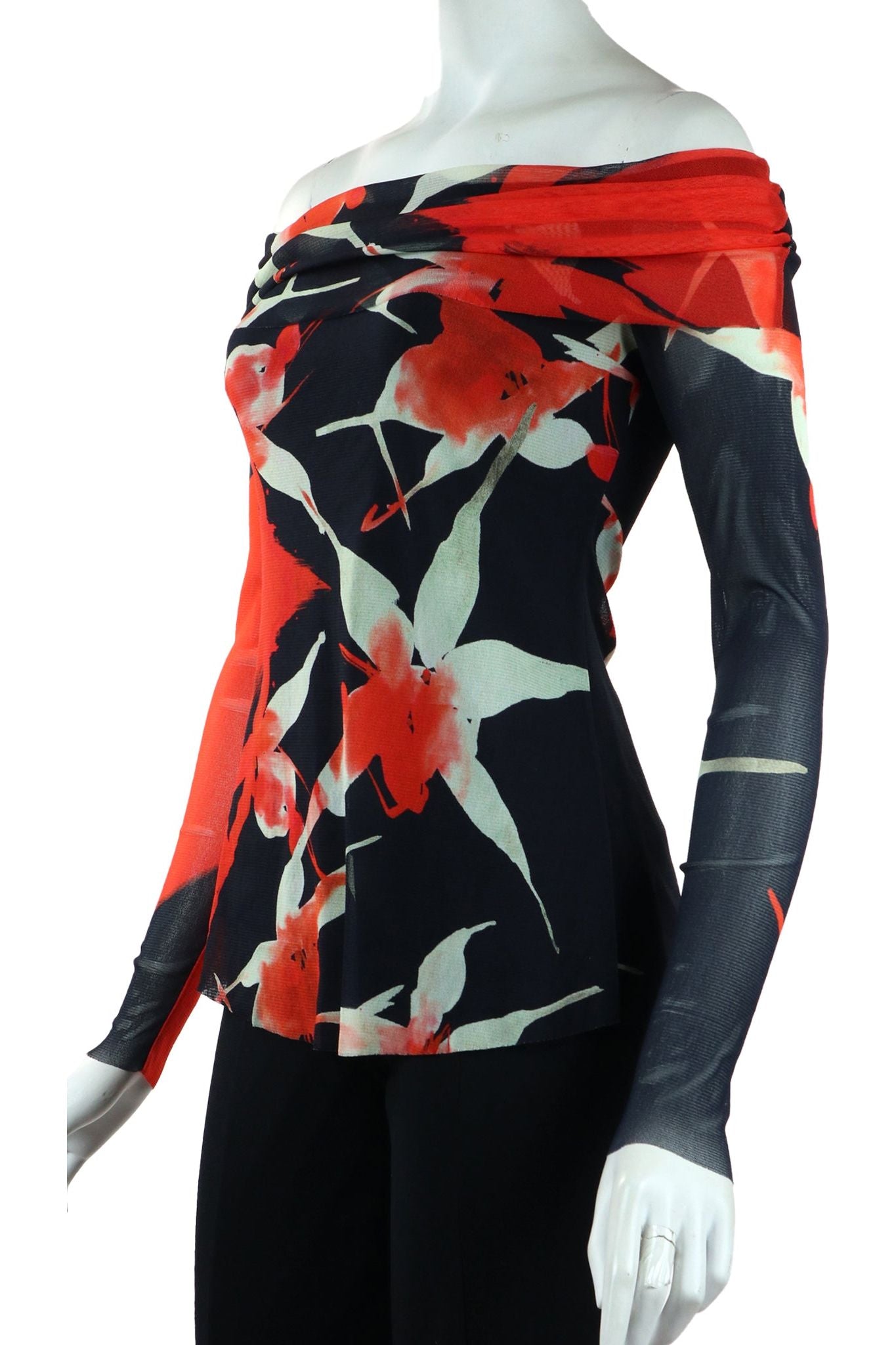 -- -- -- TULIP Draped Neckline Long Sheer Mesh Sleeved Print Top – Elana Kattan
