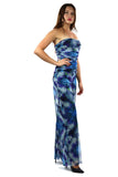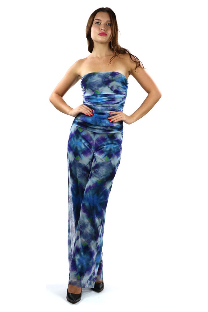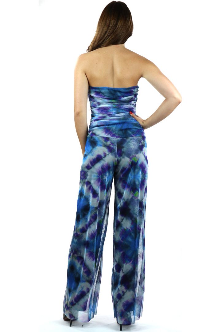 This dazzling abstract print tulle stretch jumpsuit with vibrant bursts of blues and greens with a splash of purple.